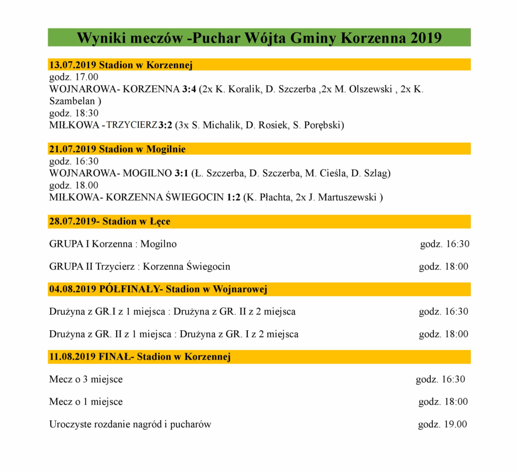 21 lipca ( w niedzielę ) na Stadionie w Mogilnie odbyły się dwa kolejne mecze z cyklu Puchar Wójta. Pierwszy z nich wygrała Wojnarowa z wynikiem 3 : 1. Mecz odbył się o 16:30, a ich przeciwnikiem była drużyna z Mogilna. O godzinie 18:00 rywalizowali ze sobą Miłkowa – Korzenna Świegocin. Ostateczny wynik to 1 : 2 dla Korzennej Świegocin. Kolejne mecze odbędą się 28.07.2109 w godzinach 16:30 i 18:00 na stadionie w Łęce.