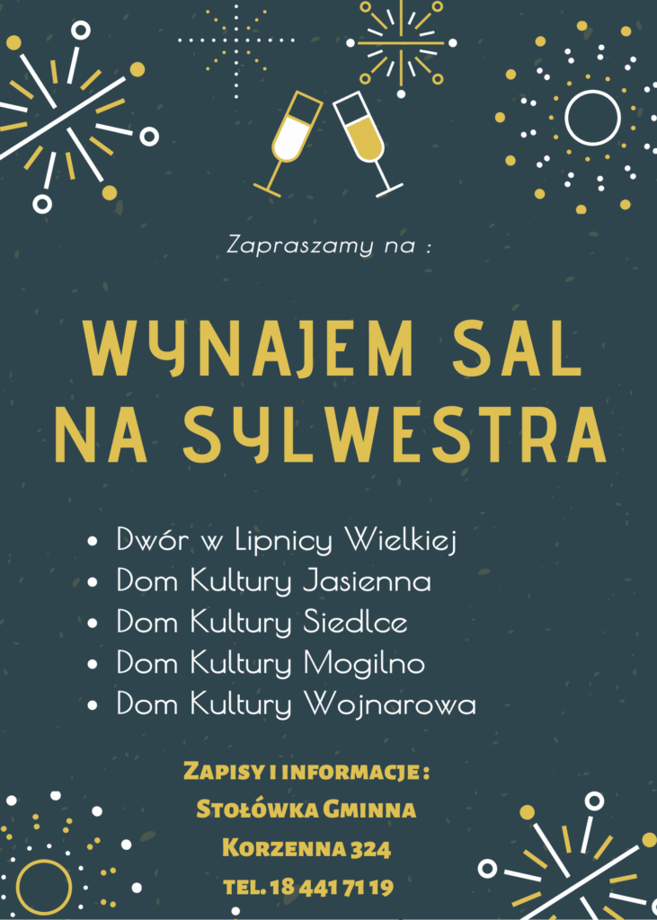 Chcielibyście spędzić Sylwester 2021/2022 w większym gronie, jednak obawiacie się, ze Wasze mieszkanie nie pomieści wszystkich znajomych? Do Państwa dyspozycji oddajemy sale w naszych placówkach: DK w Mogilnie, DK w Siedlcach, Dwór w Lipnicy Wielkiej. Szczegółowe informacje dotyczące atrakcyjnej oferty znajdą Państwo dzwoniąc pod numer tel. : 18 441 71 19 – Stołówka Gminna w Korzennej.