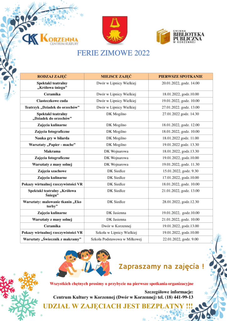 Ofertę zajęć na czas zbliżających się ferii zimowych przygotowało Centrum Kultury w Korzennej przy współpracy Urzędu Gminy oraz Gminnej Biblioteki Publicznej. W ofercie ferii zimowych 2022 każdy uczeń znajdzie coś dla siebie. Oferujemy zajęcia artystyczne i edukacyjne. Zainteresowanych zapraszamy na pierwsze zajęcia organizowane w placówkach.