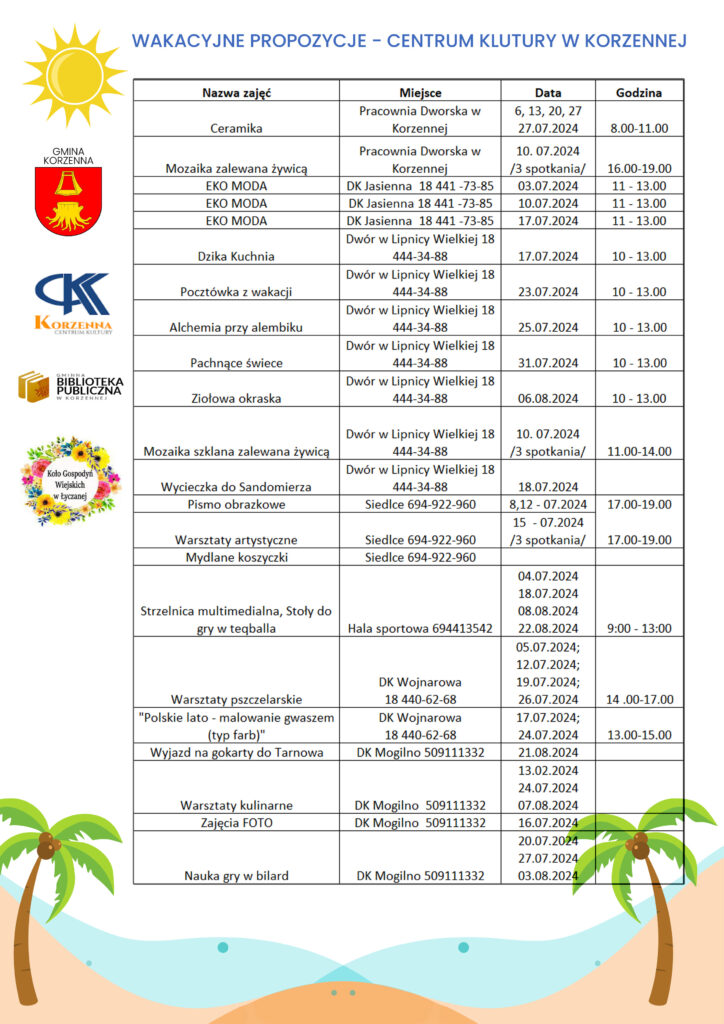 Wakacje już rozpoczęte! Przygotowaliśmy z tej okazji bogatą ofertę dla najmłodszych i nie tylko. Zapraszamy wszystkich mieszkańców Gminy Korzenna do skorzystania z zajęć, rozrywki oraz wycieczek. Wszelkich informacji można zasięgnąć telefonicznie.