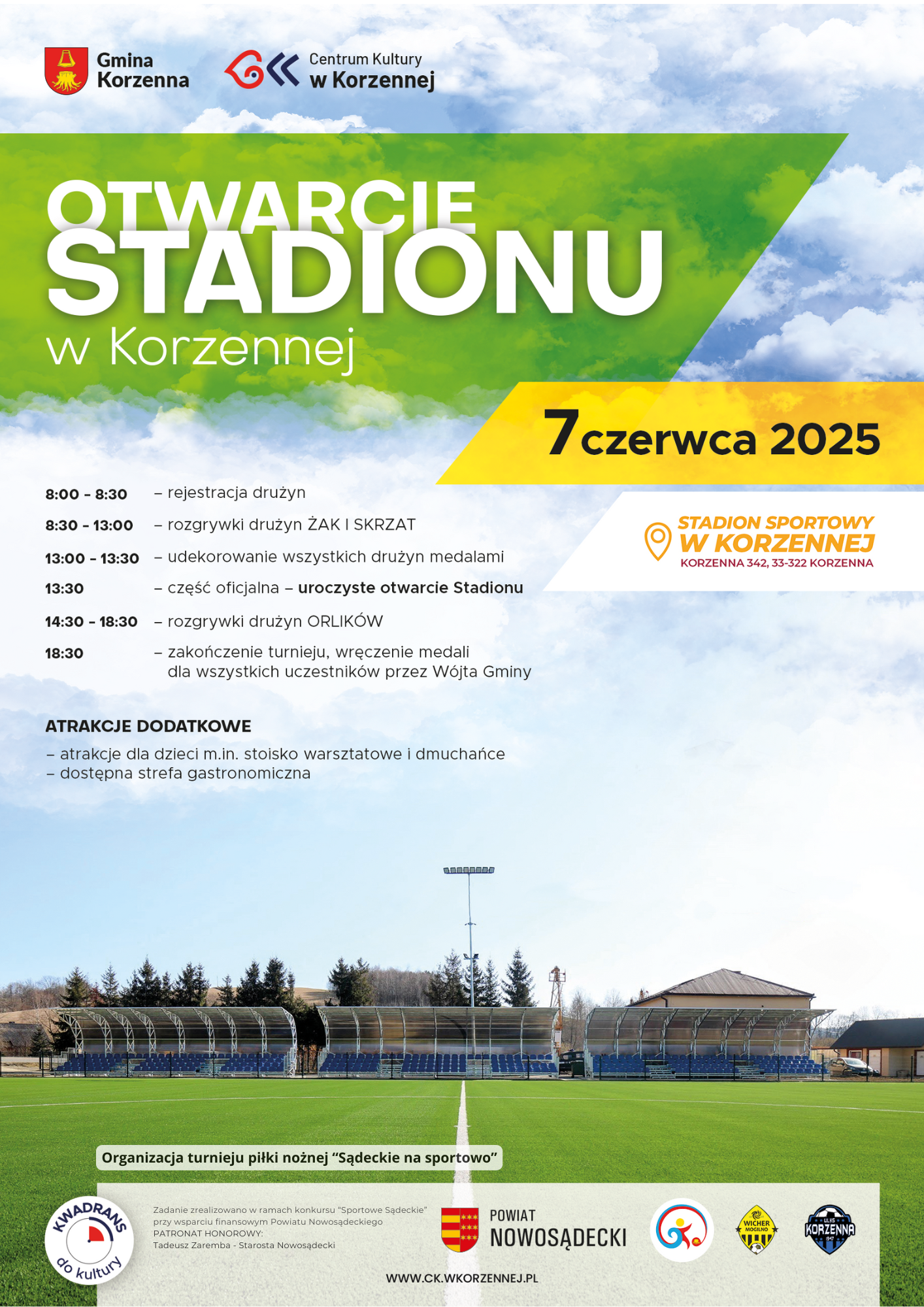 Wójt Gminy Korzenna z radością zaprasza na uroczyste otwarcie nowo wybudowanego Stadionu Sportowego w Korzennej.