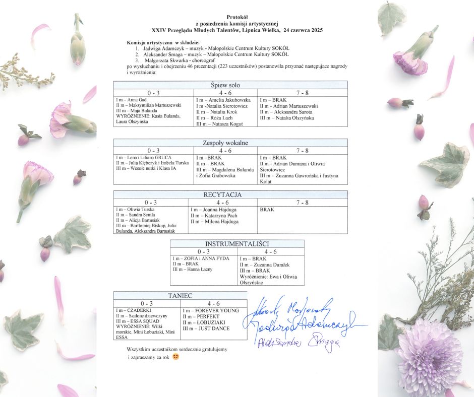Dziś Dwór w Lipnicy Wielkiej tętnił muzyką, tańcem, poezją i… ogromem talentu! Na scenie zaprezentowało się aż 223 młodych artystów w ramach 46 wyjątkowych występów – soliści, zespoły wokalne, instrumentaliści, tancerze i recytatorzy. Było różnorodnie, emocjonująco i – co najważniejsze – z sercem! ❤️ Na początek wszystkich ciepło powitał Dyrektor Centrum Kultury w Korzennej, Pan Benedykt Polański, który nie szczędził słów wsparcia i otuchy naszym występującym. A potem już… poleciało! 🎤💃🎻 Jury miało naprawdę twardy orzech do zgryzienia – nie było łatwo rozstrzygnąć kto jest najlepszy ponieważ każdy występ był wyjątkowy na swój sposób.
