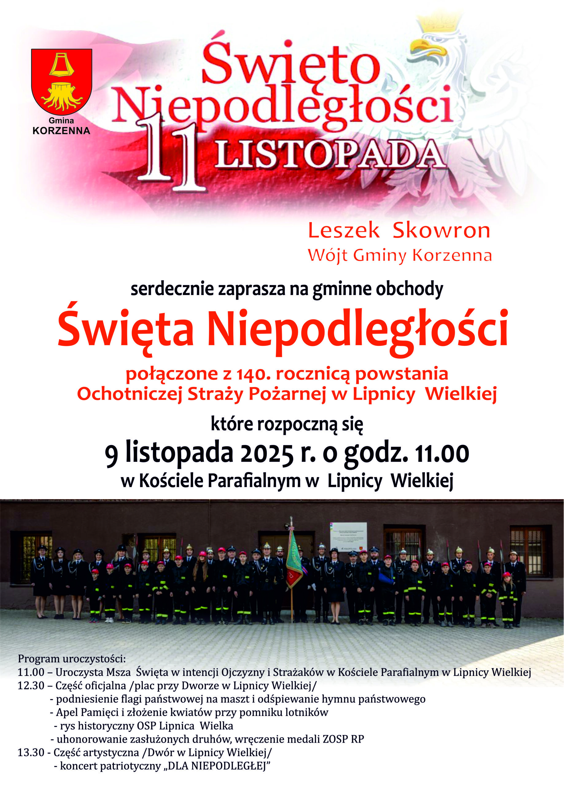 Zapraszam do wspólnego świętowania! 9 Listopada w Lipnicy Wielkiej odbędą się gminne obchody Święta Niepodległości po łączone z 140. rocznicą powstania Ochotniczej Straży Pożarnej w Lipnicy Wielkiej!