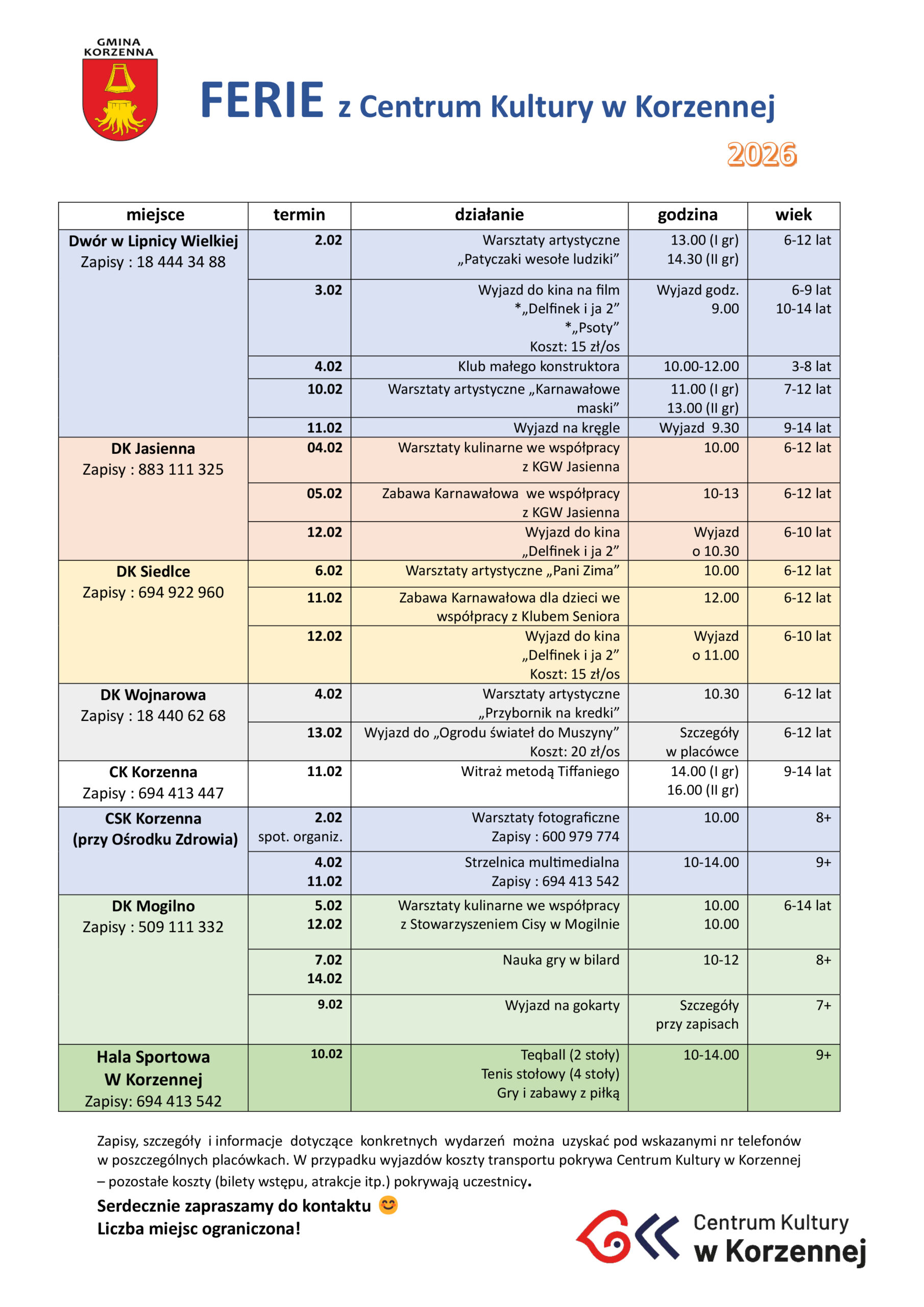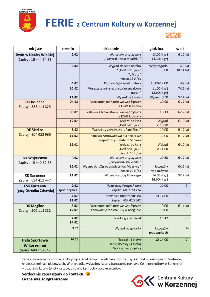 Zapraszamy wszystkich mieszkańców Gminy Korzenna – dzieci i młodzież – do wspólnej zabawy podczas nadchodzących ferii zimowych! Przygotowaliśmy dla Was mnóstwo atrakcji w naszych placówkach. ☃️
