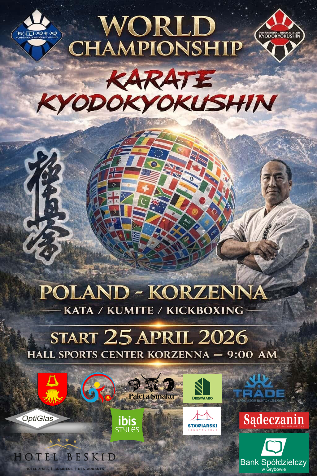 Wielkimi krokami zbliża się najważniejsze sportowe wydarzenie tego roku w naszym regionie! 🌍🇵🇱 Już 25-26 kwietnia Gmina Korzenna stanie się globalną areną zmagań najlepszych wojowników z różnych zakątków globu! Zapraszamy wszystkich fanów mocnych wrażeń na 🏆 WORLD CHAMPIONSHIP KARATE KYODOKYOKUSHIN 🏆!