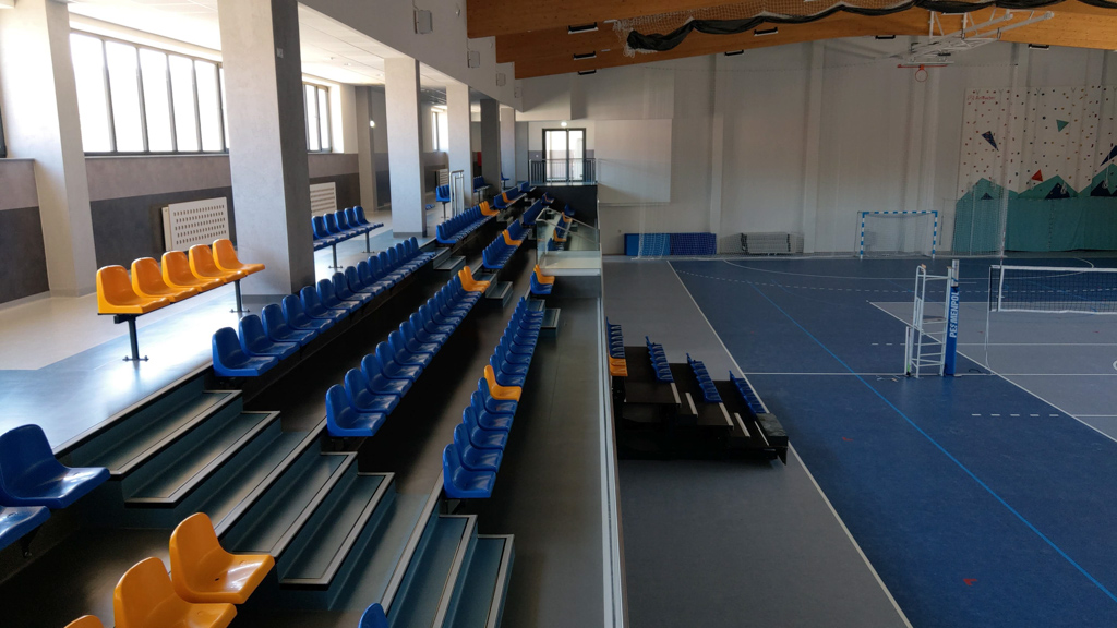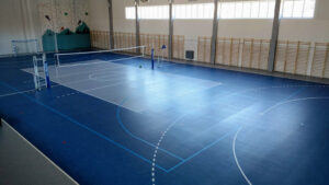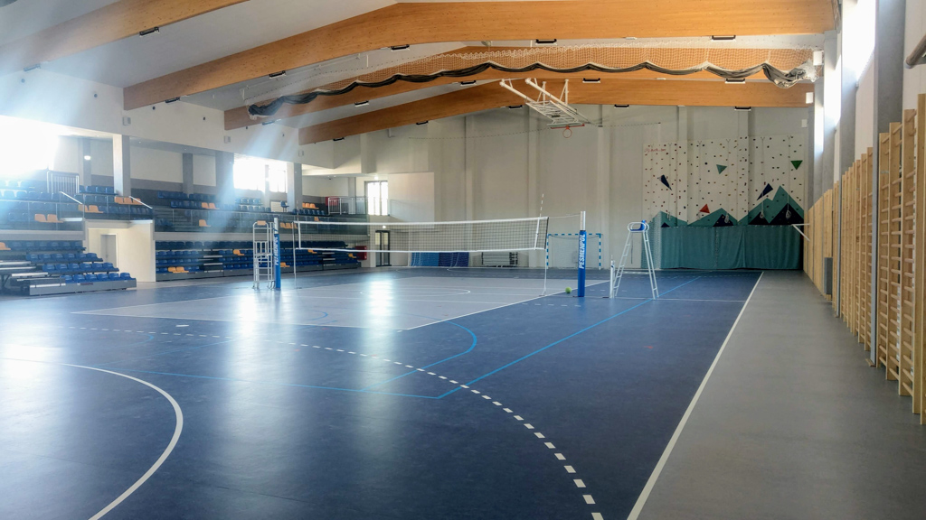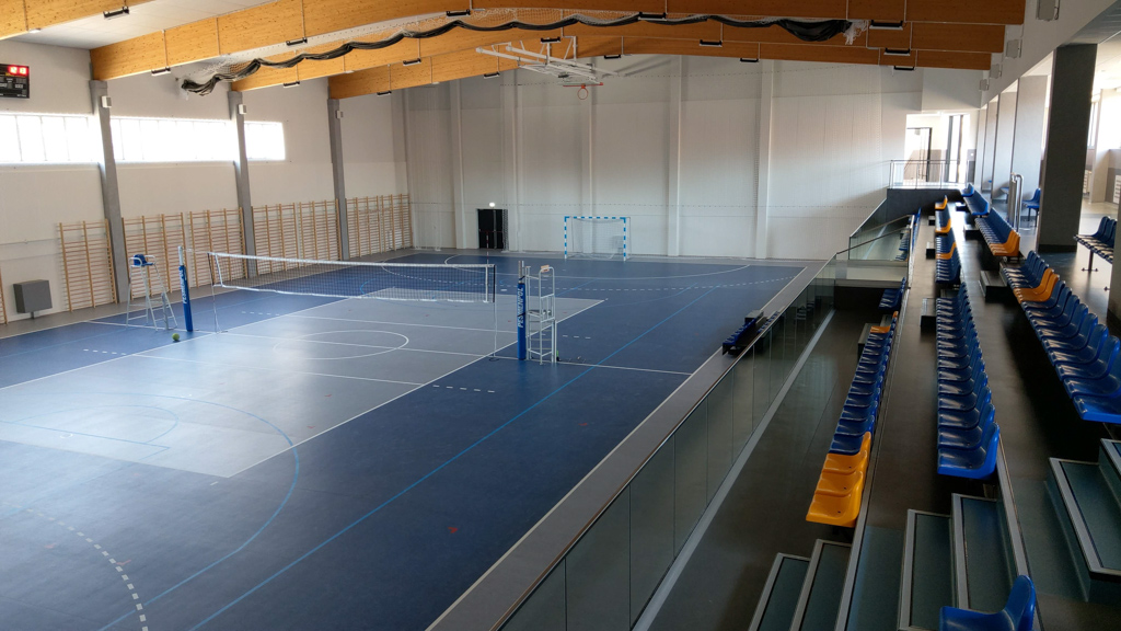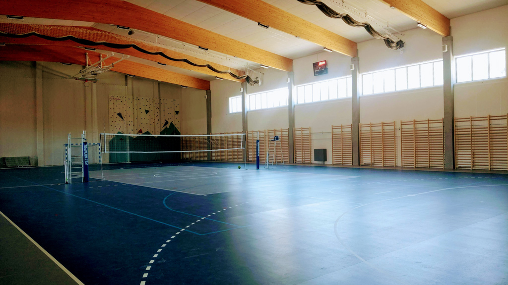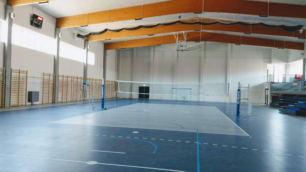 - osprzęt do uprawiania różnych dyscyplin sportowych m.in.: trzy komplety siatkarskie tj. stelaż plus siatka, stanowiska dla sędziów, siatka i stelaż do tenisa, dwie bramki aluminiowe (2m. x 3m.) do piłki ręcznej/futsalu z piłkołapaczem – z możliwością ich demontażu, dwa przysufitowe kosze – rozkładane elektrycznie w razie potrzeby gry w koszykówkę, trzy przysufitowe kotary rozkładane elektrycznie rozdzielające płytę boiska na trzy równe części, cztery stoły do tenisa stołowego, sprzęt gimnastyczny (m.in. materace miękkie do ćwiczeń gimnastycznych, ławeczki, skrzynie, odskocznie, drążki), sprzęt do sportów lekkoatletycznych (m.in. płotki, osprzęt wraz z materacem do skoku wzwyż), 20 materacy ciężkich, wąskich do tworzenia mat do uprawiana sportów różnych sztuk walki, osprzęt do ścianki wspinaczkowej oraz różnego rodzaju piłki, rakiety oraz inne przybory sportowe.